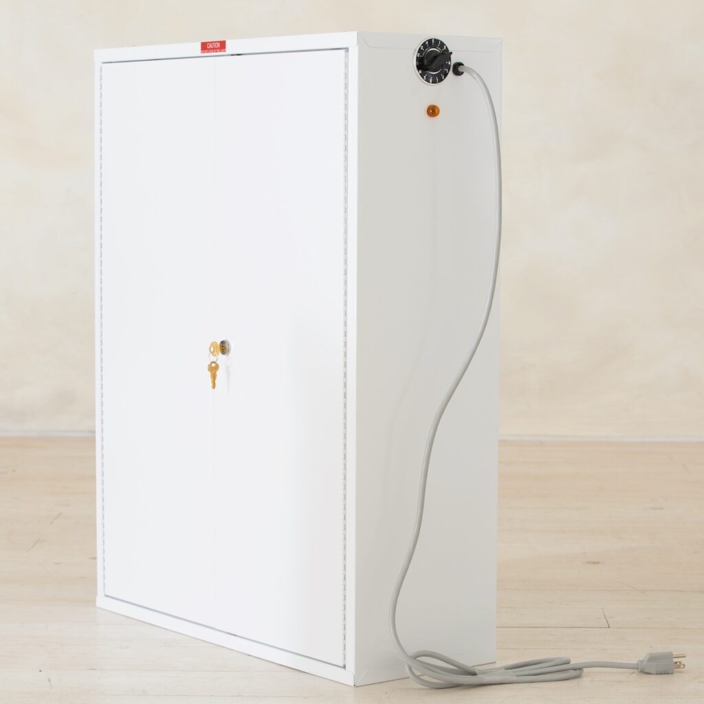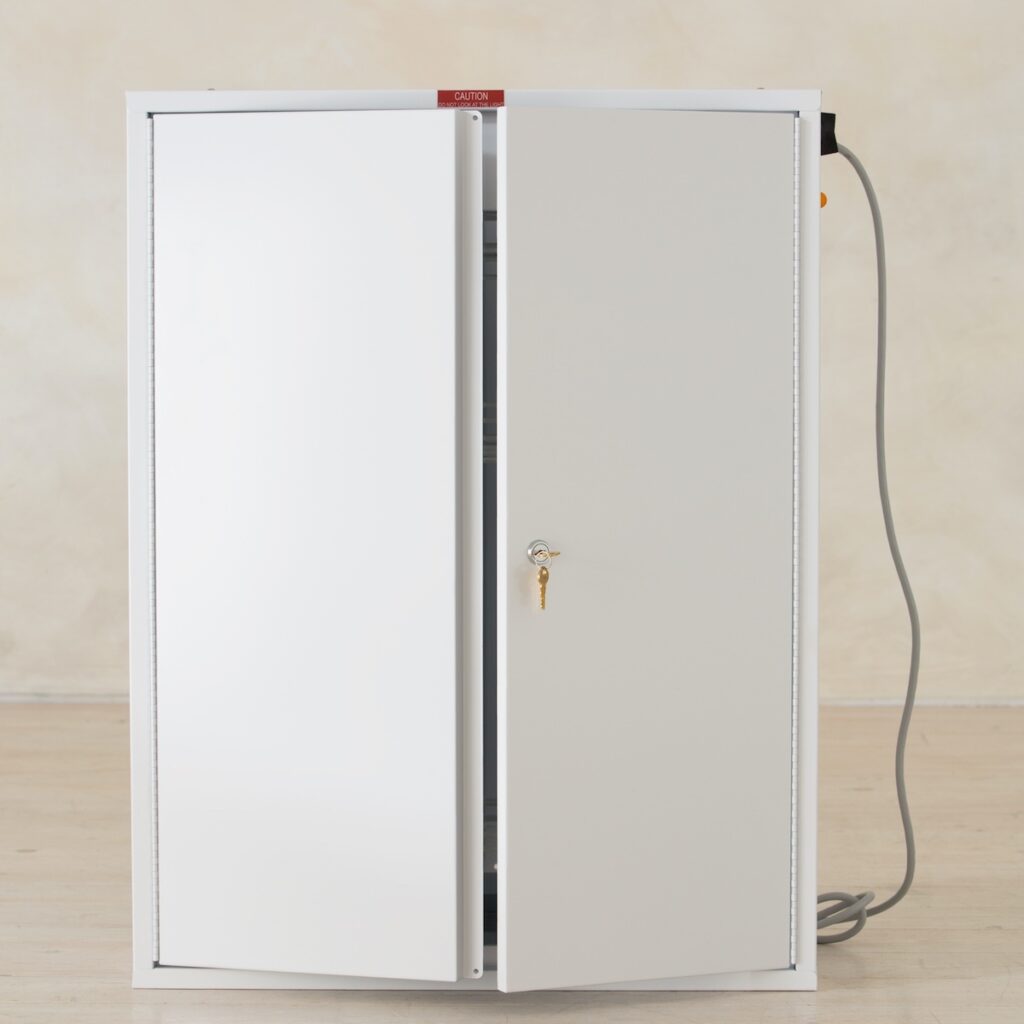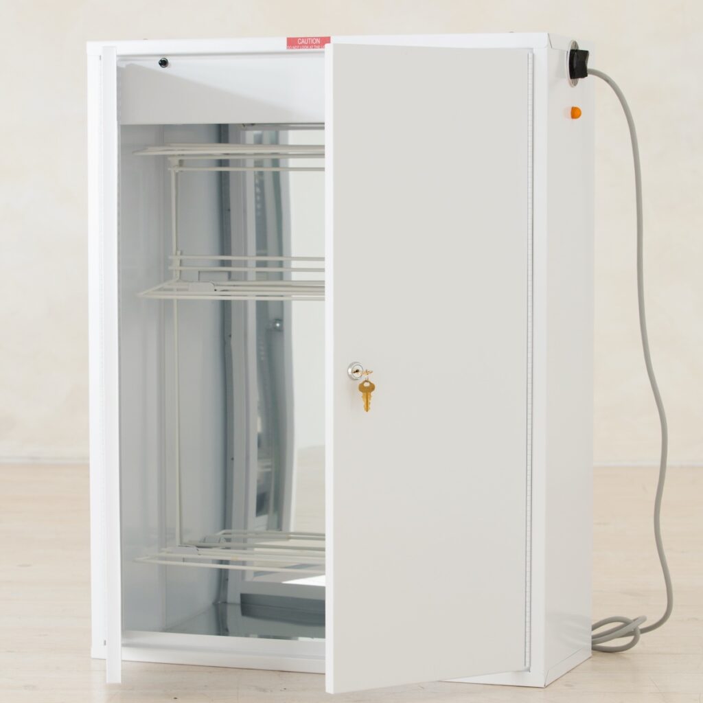 - Sturdy cabinet seals completely, preventing accidental exposure